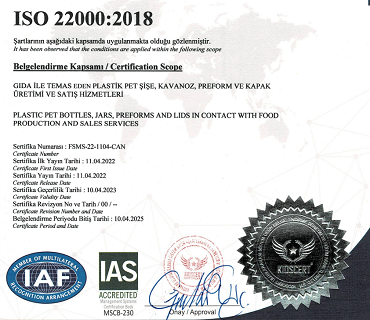 Kalite yönetim sistemimiz ISO 9001 sertifikalıdır. Ayrıca Can Pet, sizin için en güvenli ambalajı üretmeye kendini adamıştır. Gıda endüstrisi için ambalaj söz konusu olduğunda, katı hijyen standartları vardır. Gıda güvenliği politikamızın temeli Ambalaj Malzemeleri standardıdır. Gıda güvenliğini en üst düzeye çıkarmayı ve tüketici sağlığının optimum düzeyde korunmasını amaçlar. Can Pet'ın net hijyen düzenlemeleri, çalıştırma talimatları ve kayıt sistemleri hazırlamasının nedeni budur. ISO 9001 sertifikamızı indirmek için lütfen aşağıdaki iki bağlantıyı kullanın. Bağlantılar çalışmıyorsa, lütfen info@canpetplastik.com adresinden bizimle iletişime geçin .